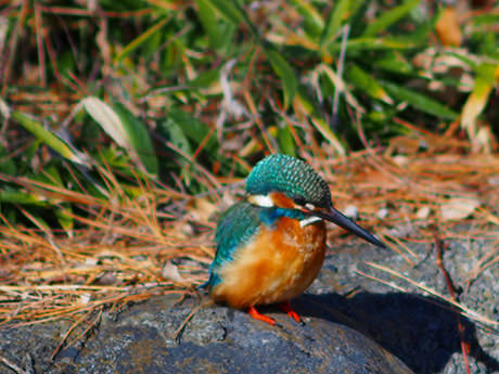 たまたま通りかかった愛媛県からの観光客の方に、「カワセミがとまっていますよ。」と教えてあげたところ、魚をねらってダイブしました。太陽の光に背中の瑠璃色が実に美しく、『初めてカワセミを見ました。きれいですね。ずいぶんと得をした気分です。』と言っていただきました。